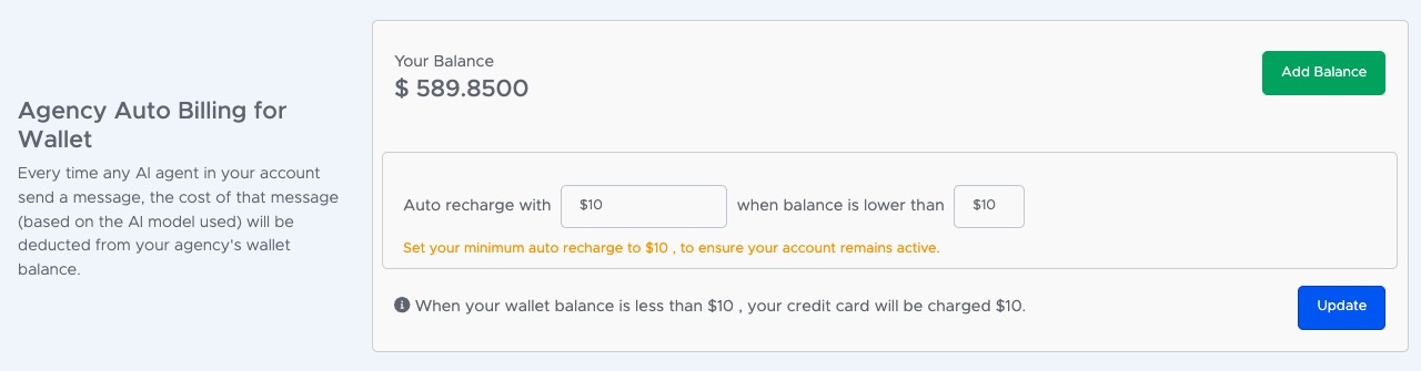 Your agency's wallet is charged for each AI message sent. You set a minimum balance threshold and a recharge amount. When the wallet balance falls below the threshold, your credit card is automatically charged with the recharge amount. For example, if you set a $10 threshold and $50 recharge, your card will be charged $50 when the balance drops below $10.