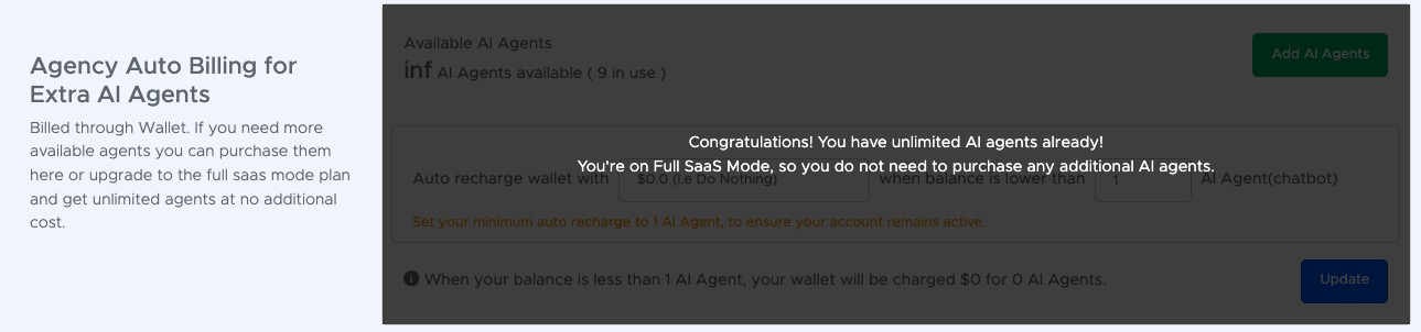 Billed through Wallet. If you need more available agents you can purchase them here or upgrade to the full saas mode plan and get unlimited agents at no additional cost.