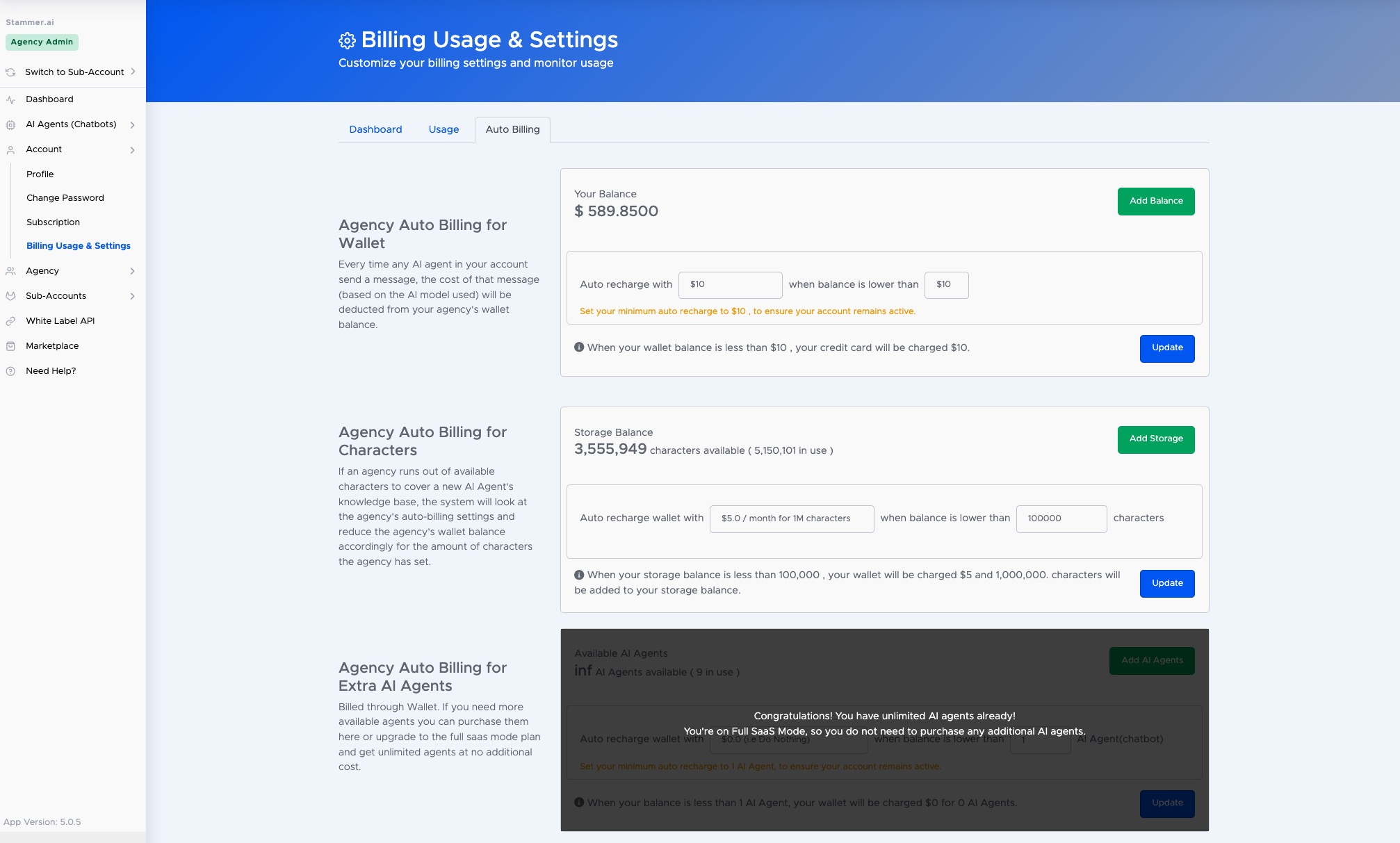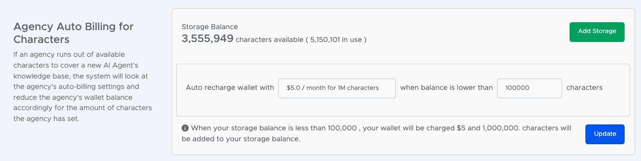 If an agency runs out of available characters to cover a new AI Agent's knowledge base, the system will look at the agency's auto-billing settings and reduce the agency's wallet balance accordingly for the amount of characters the agency has set. For example, when your storage balance is less than 100,000 characters, your wallet will be charged $5 and 1,000,000 characters will be added to your storage balance.