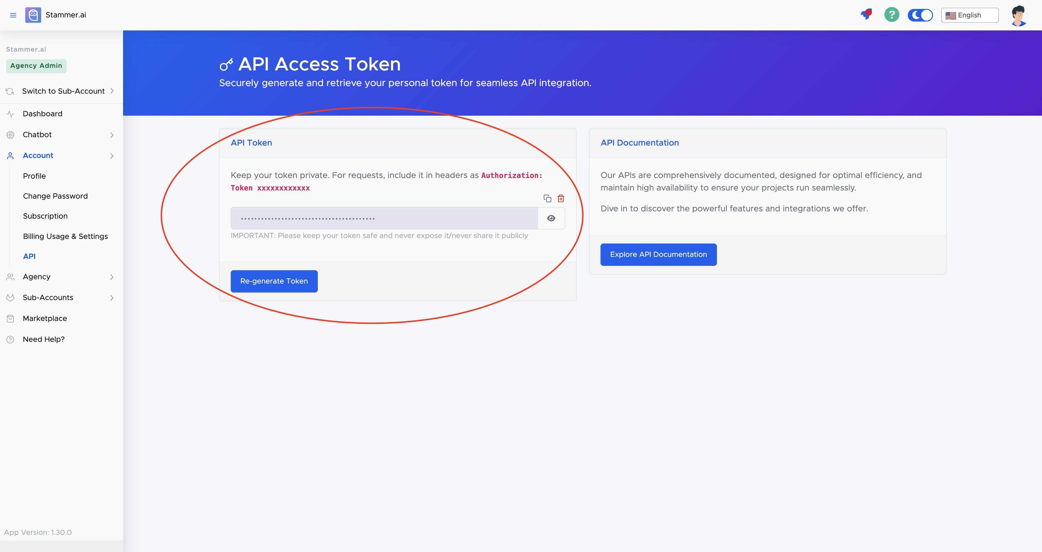 **Step 3**. From the Stammer.ai dashboard you will need to copy your API token&#x20;